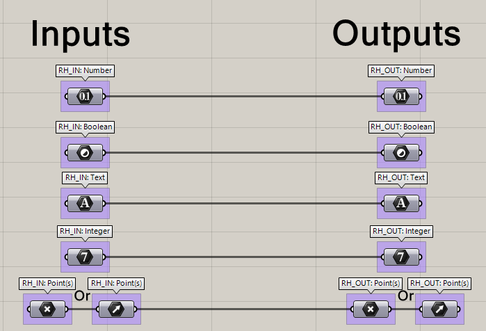 To make a Grasshopper input or output accessible to Twikbot 5, place the parameter of the respective item in a dedicated group. Name this group 'RH_IN: [Unique name]' for inputs or 'RH_OUT: [Unique name]' for outputs, depending on its function."
