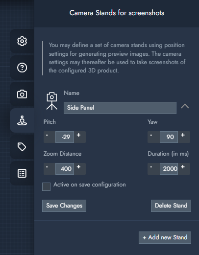 Active on save configuration | Enabling this setting triggers a preview image after a configuration is saved. Alternatively, the default camera position is used. Note: When using multiple camera stands, it is recommended to enable this setting on only one of them. |
